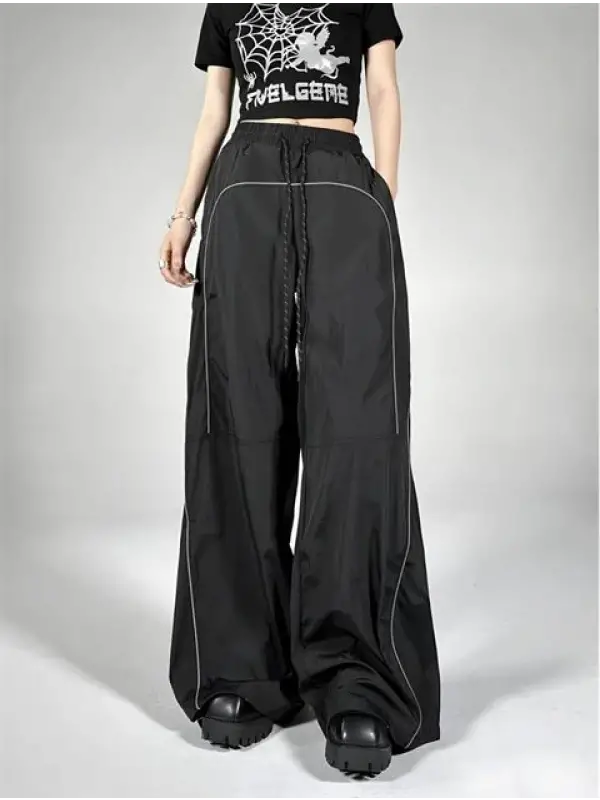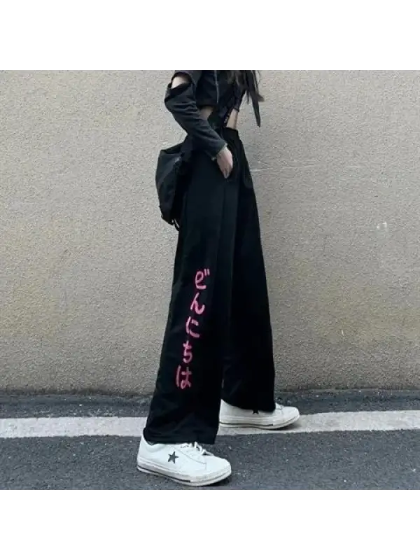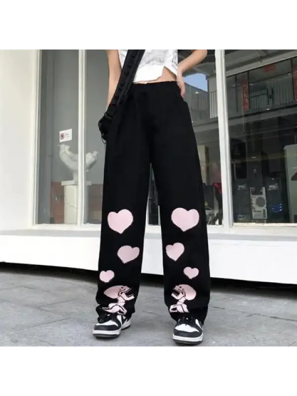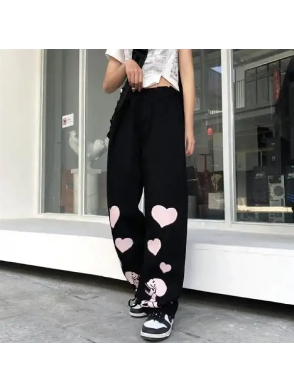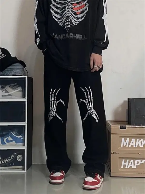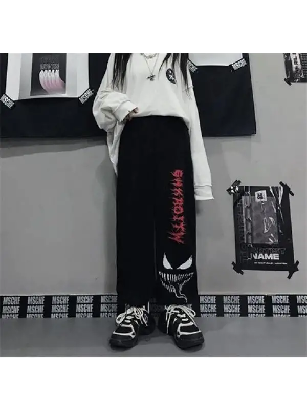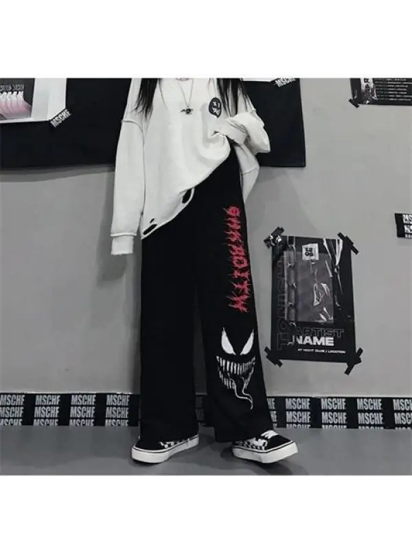 Y2K Newstyle Baskılı Wide Leg Jean Bol Paça Siyah Kot Pantolon