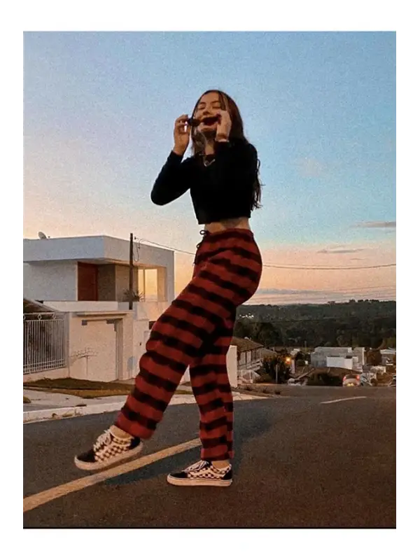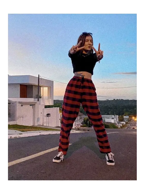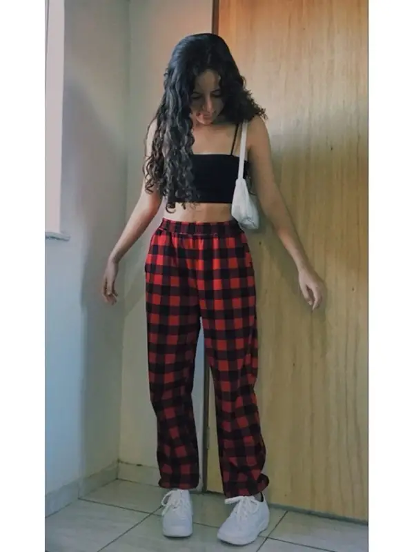 Y2K UNİSEX BELİ LASTİKLİ DETAYLI SİYAH KIRMIZI EKOSE PANTOLON