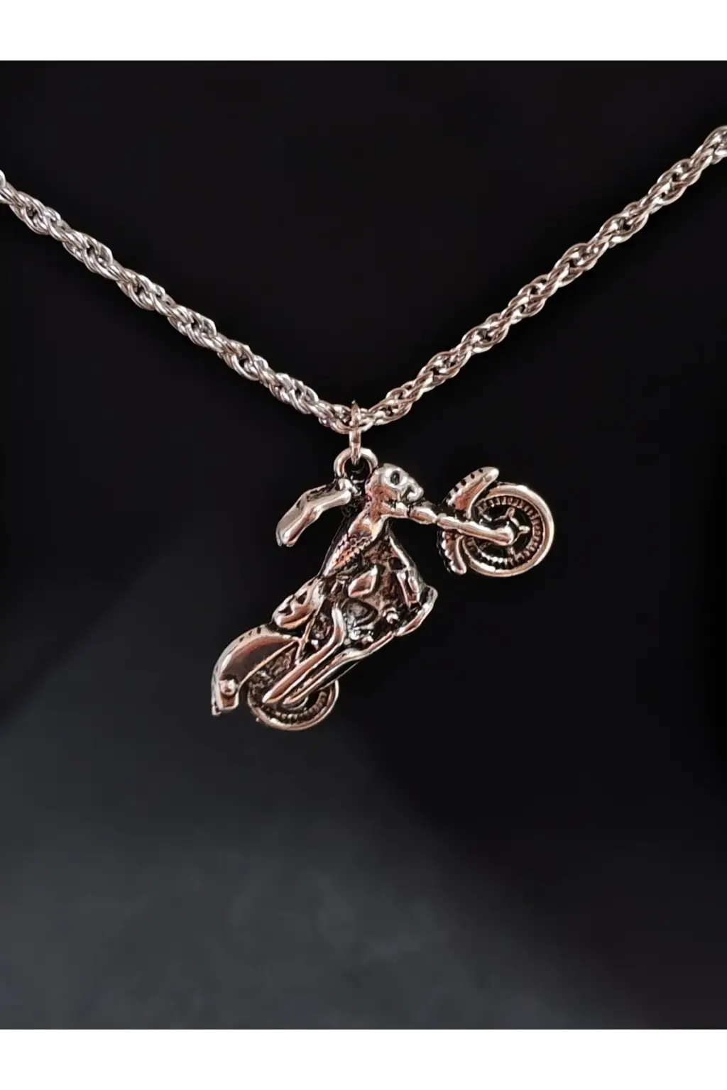 Bu ESC BUTİK markalı antik gümüş kaplama motorcu moto stil sembol unisex zincirli kolye, tarzınızı tamamlayacak şık bir aksesuardır.
