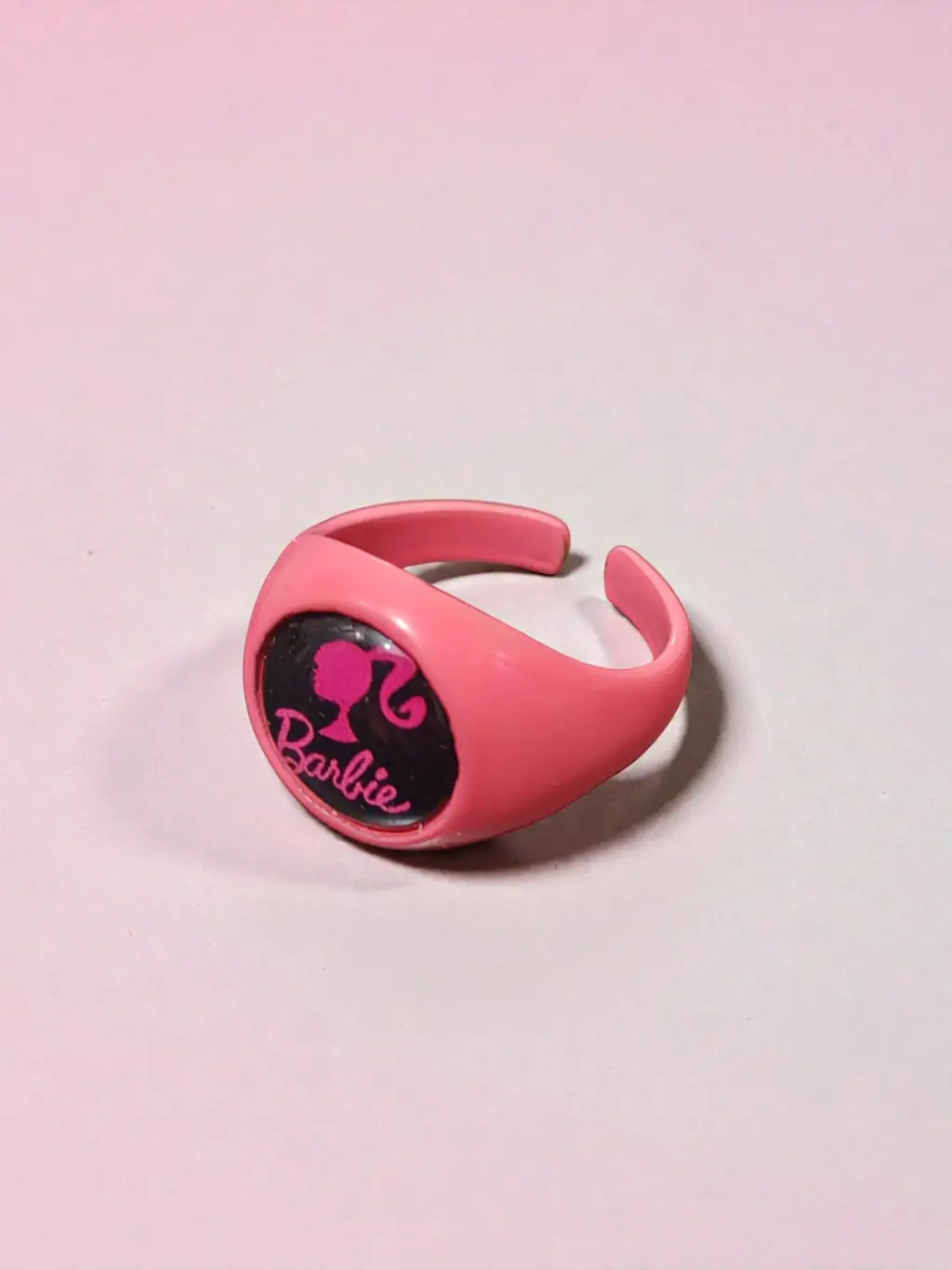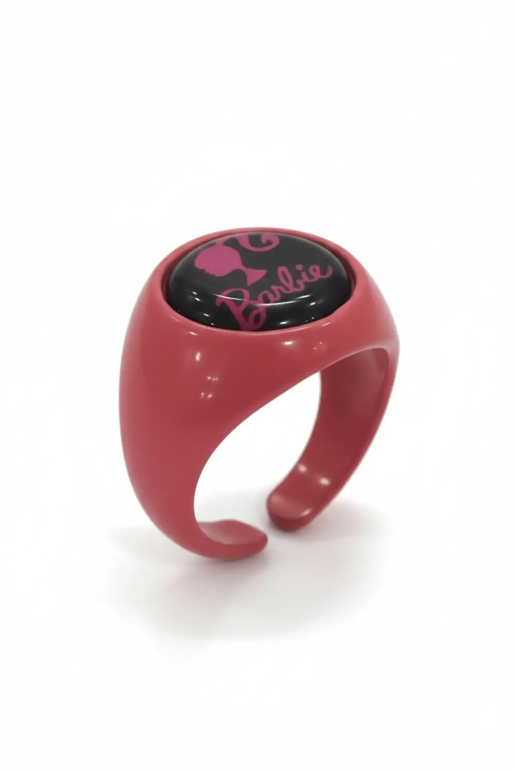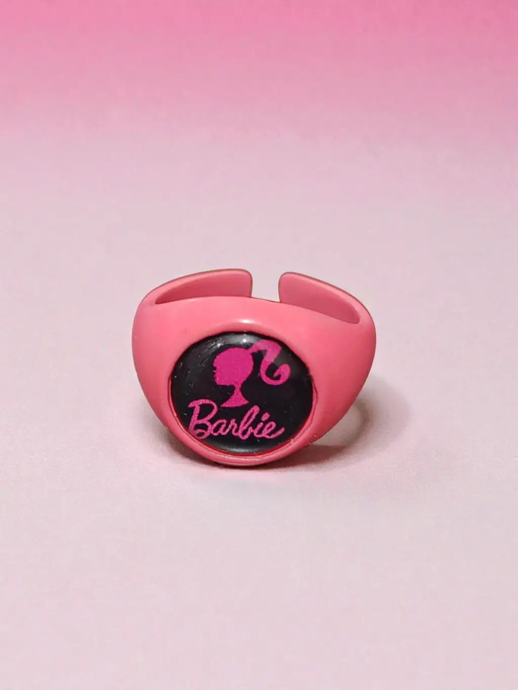 Pembe Barbie Yazılı ve Logolu Yüzük - Siyah Yuvarlak Detaylı Retro Aksesuar, göz alıcı tasarımıyla her yaş grubundan kadının beğenisini kazanmaktadır.