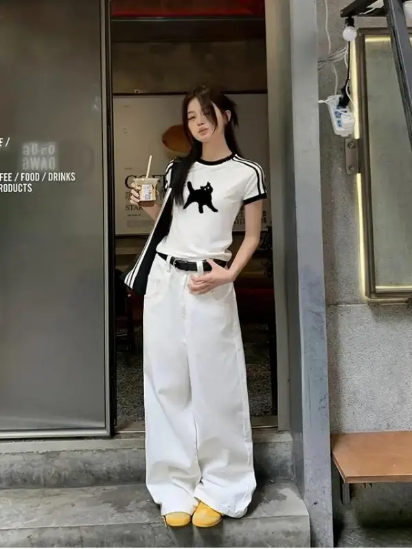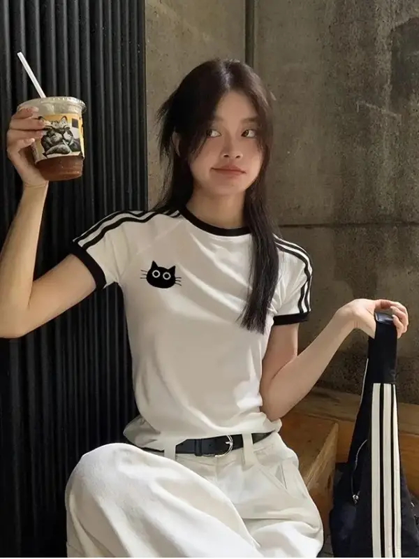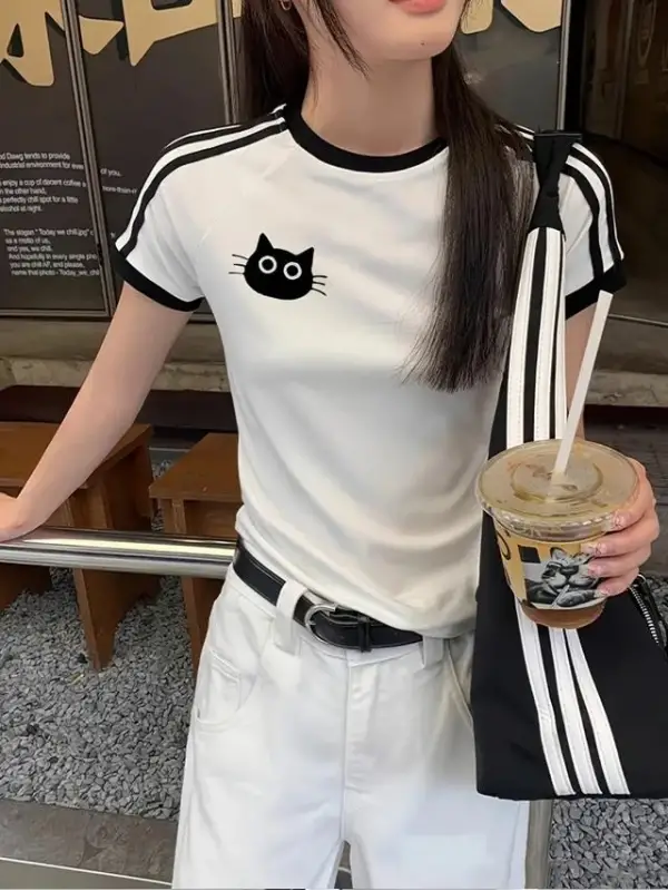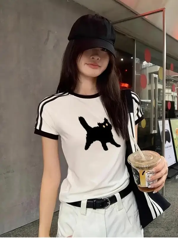 Çizmeli Kedi Baskılı Crop Top Bluz Body