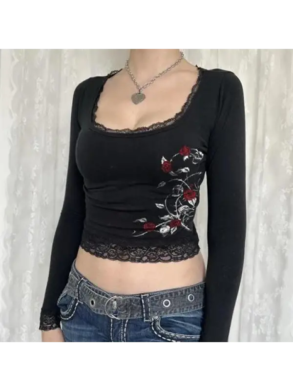 Roses & Skull Baskılı Dantel Lace Siyah Uzun Kol Bluz