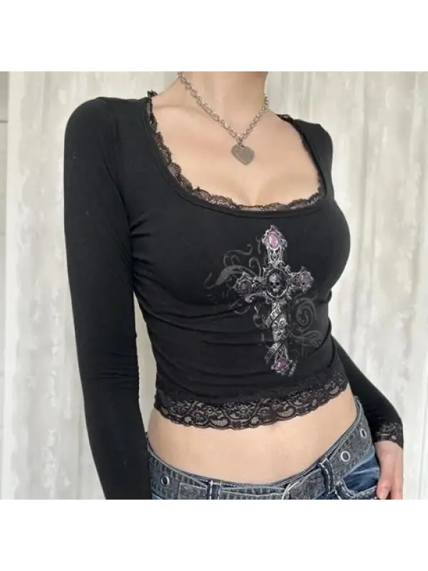 Skull In Cross Baskılı Dantel Lace Siyah Uzun Kol Bluz