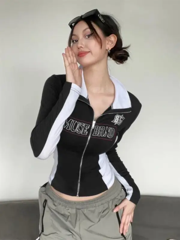 Muse Brnd Baskılı Fermuarlı Siyah Crop