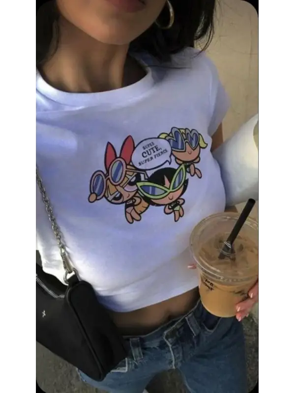 Powerpuff Girls 'Super Cute' Baskılı Beyaz Crop