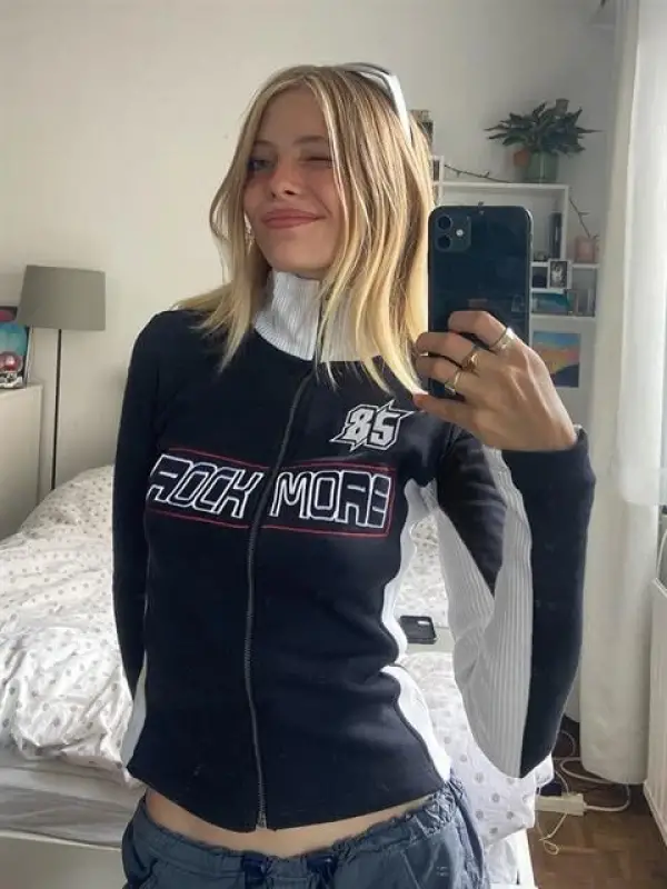 Rock More 85 Baskılı Fermuarlı Siyah Crop