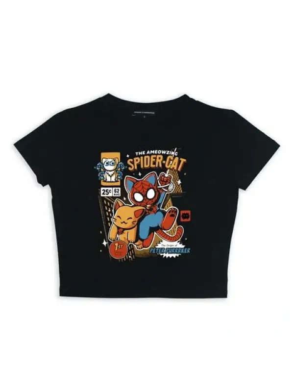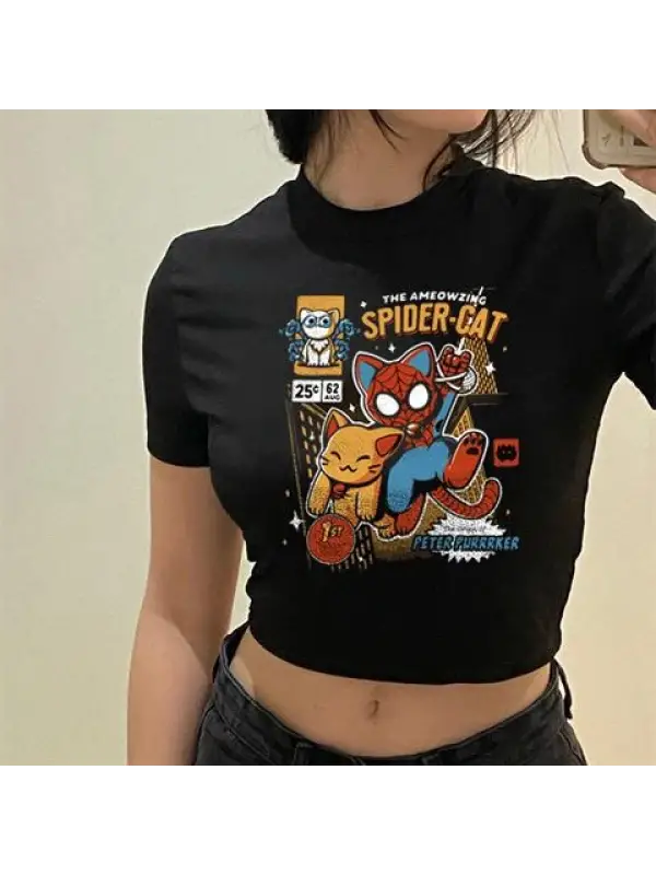 Spider-Cat Baskılı Siyah Crop