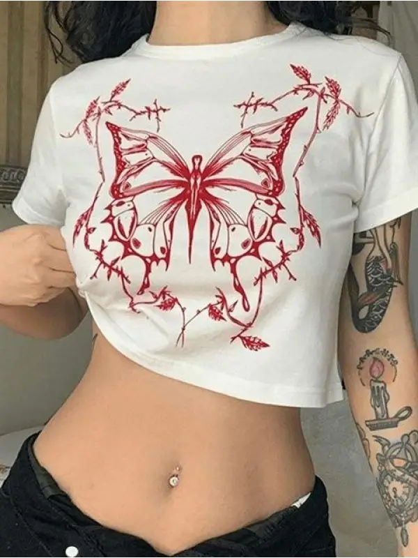 Symmetrical Butterfly Baskılı Beyaz Crop