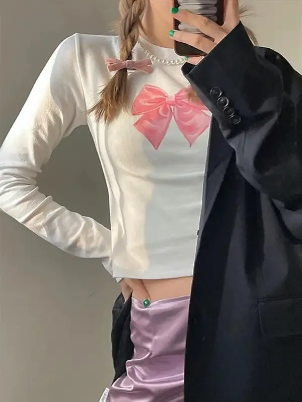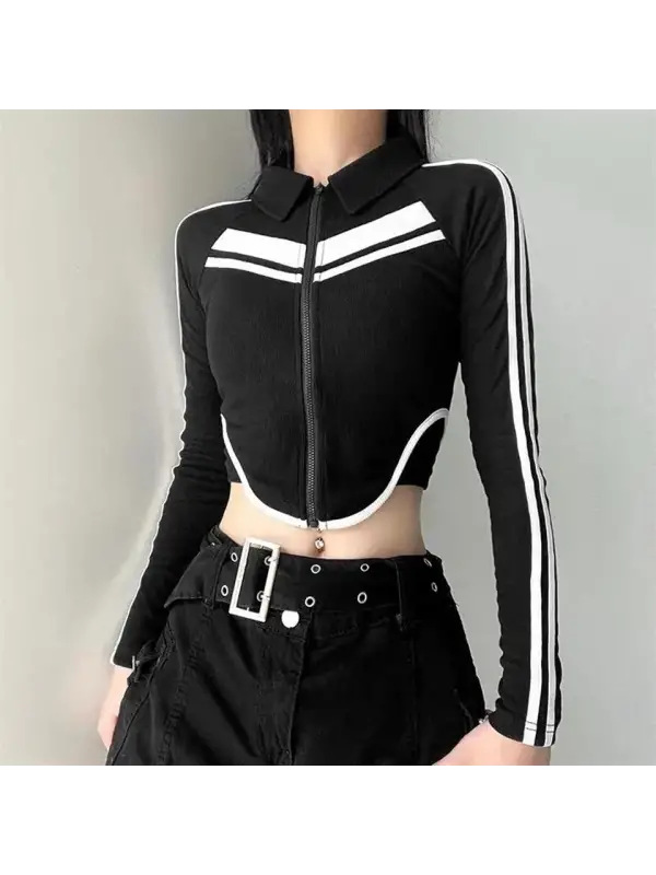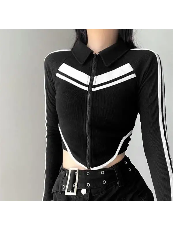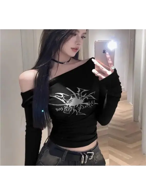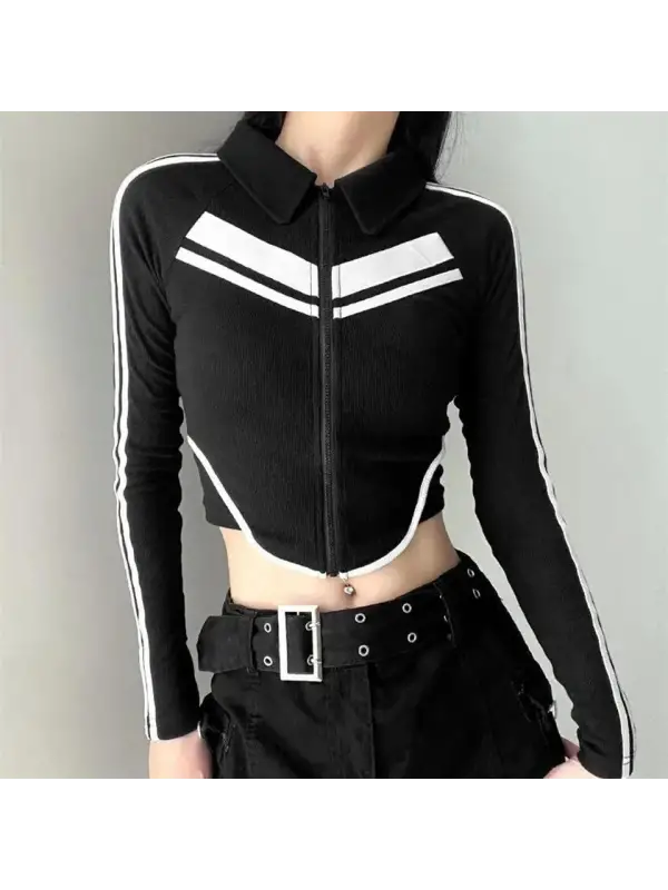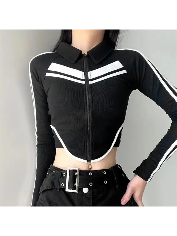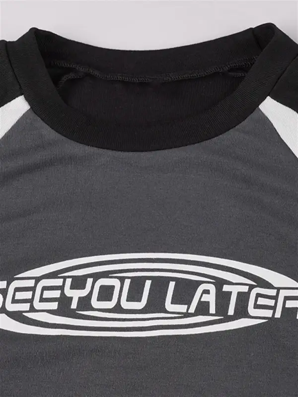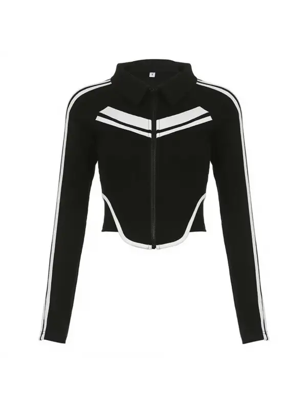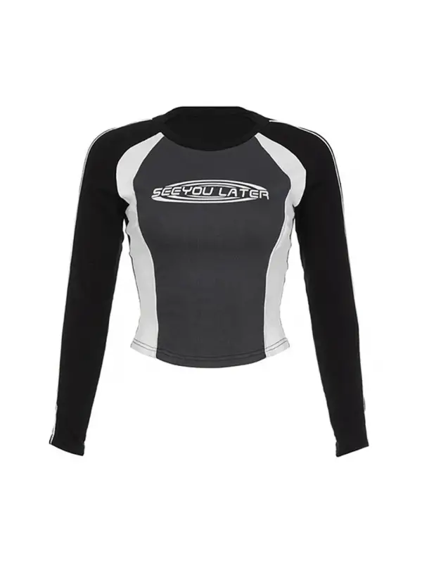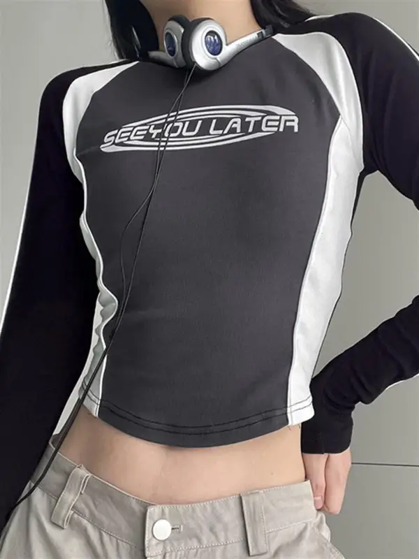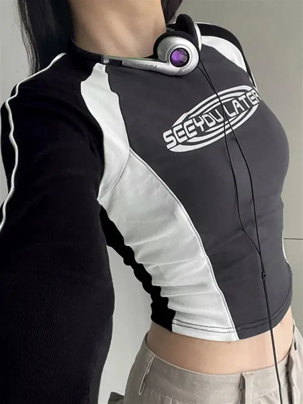 Y2k Moto Biker Şeritli Uzun Kol Baskılı Crop Bluz