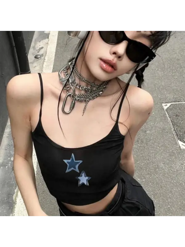Siyah Denim Renk Star Baskılı Kadın Ip Askılı Büstiyer Crop