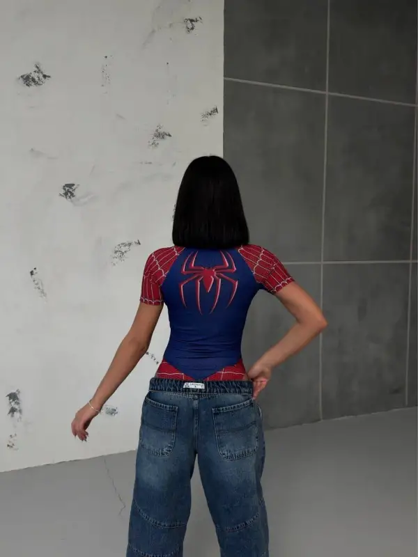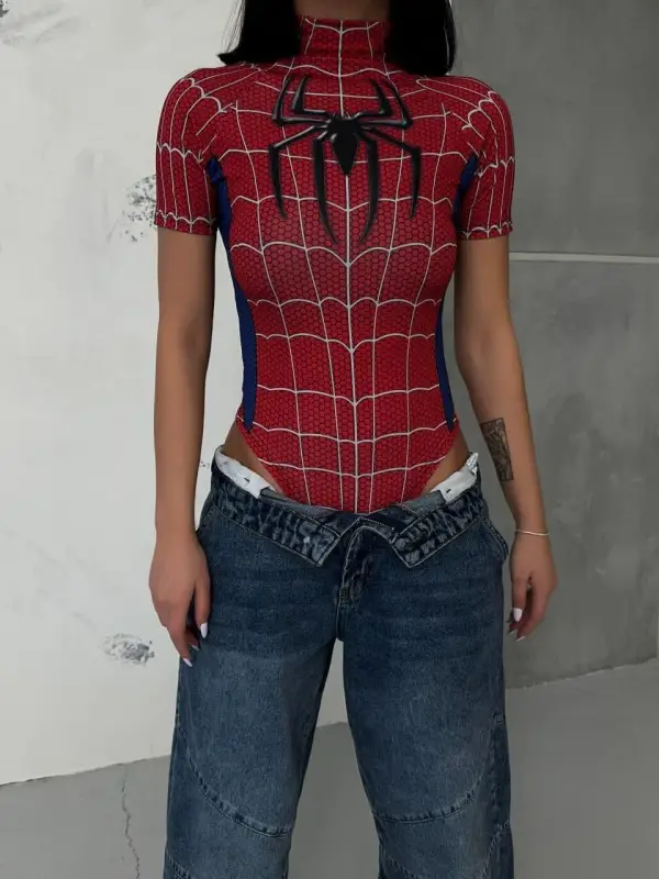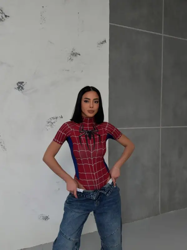 Dijital Baskılı Kısa Kollu Spider Çıtçıtlı Crop Bluz