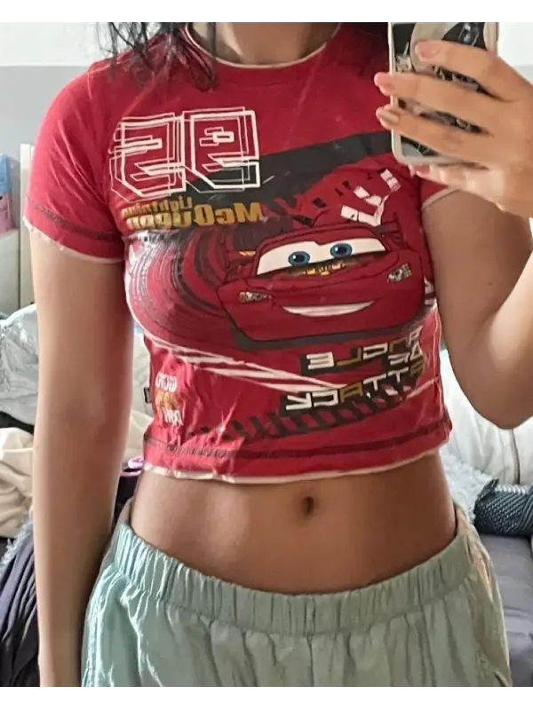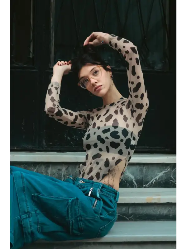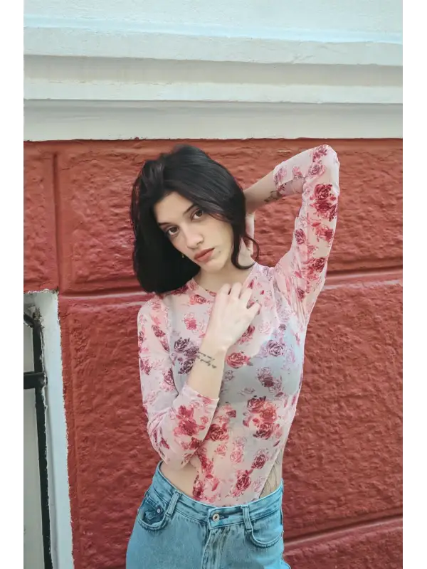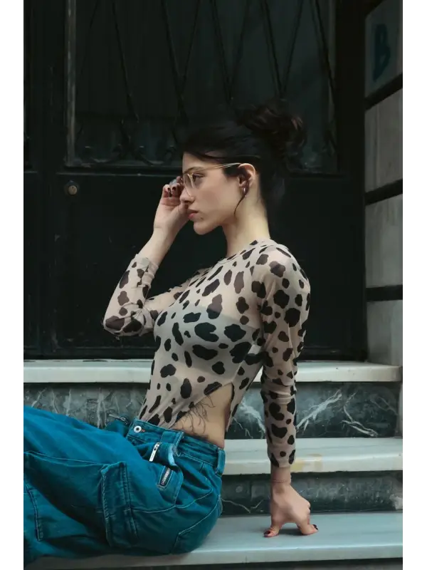 Dijital Baskılı Kısa Kollu Çıtçıtlı Crop Bluz