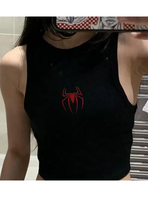 Spider Nakışlı Siyah Halter Yaka Kaşkorse Crop Top