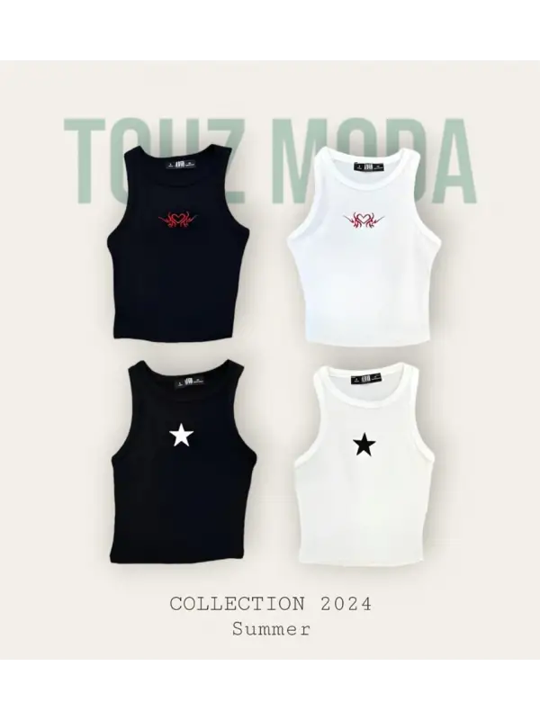 Star Nakışlı Beyaz Halter Yaka Kaşkorse Crop Top