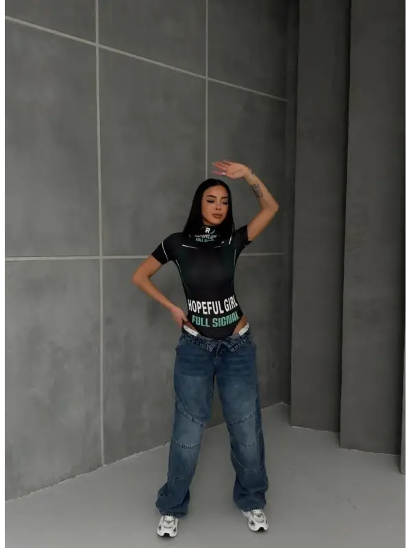 Star Nakışlı Siyah Halter Yaka Kaşkorse Crop Top