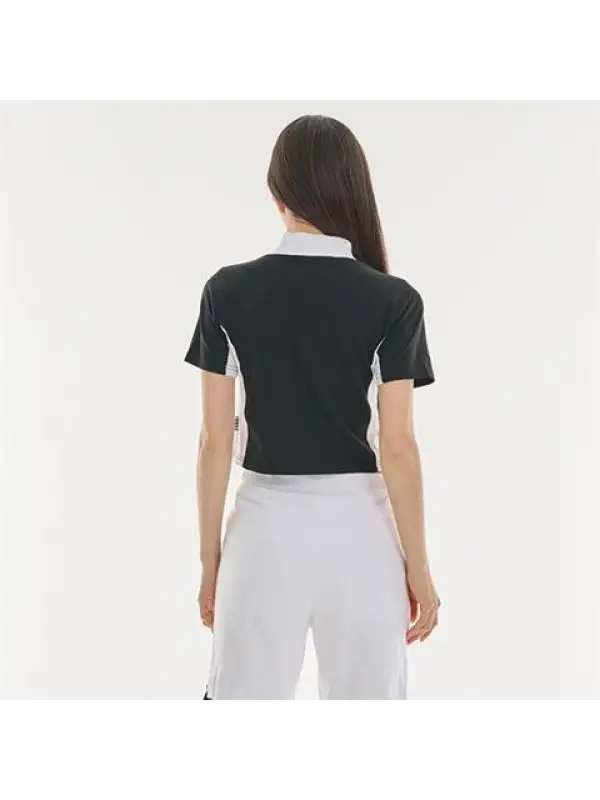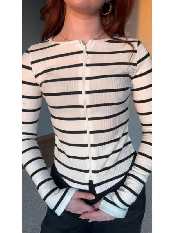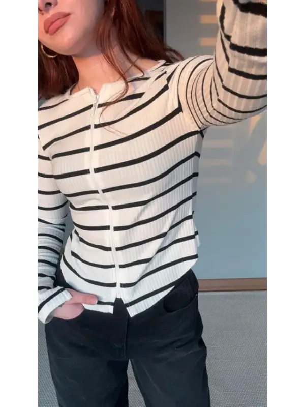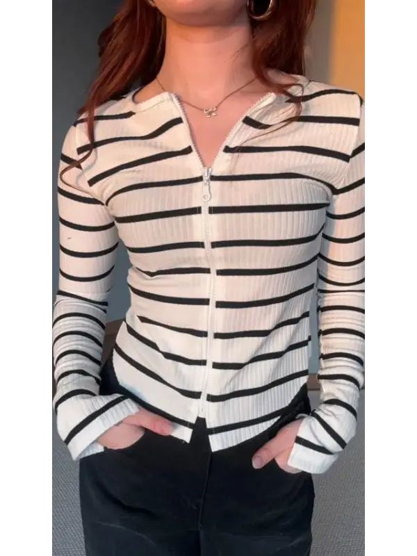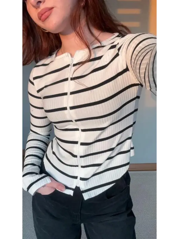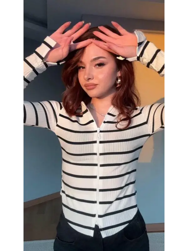 Ribanalı Çizgili Fermuarlı Crop Bluz
