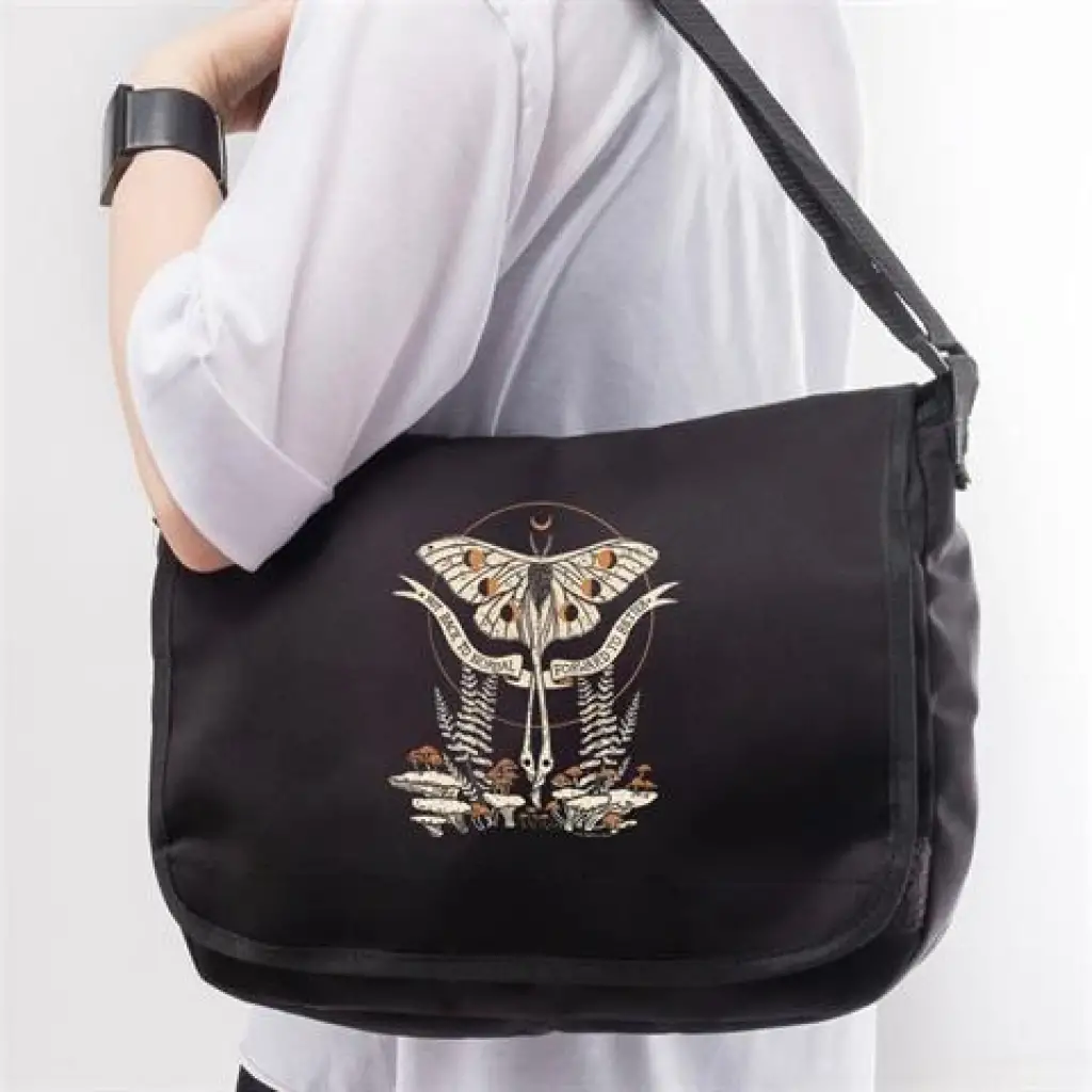Butterfly & Mushrooms Baskılı Unisex Siyah Postacı Çantası