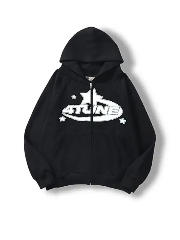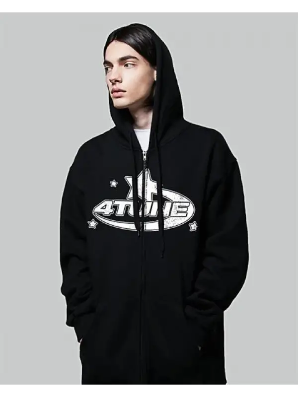 4 Tune Baskılı Baskılı Oversize Fermuarlı Siyah Unisex Kapüşonlu Hırka