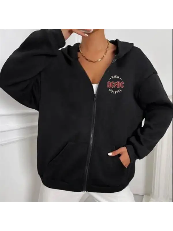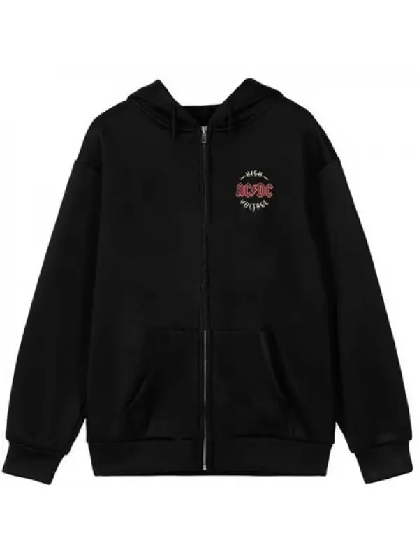 AC-DC Baskılı Oversize Fermuarlı Siyah Unisex Kapüşonlu Hırka