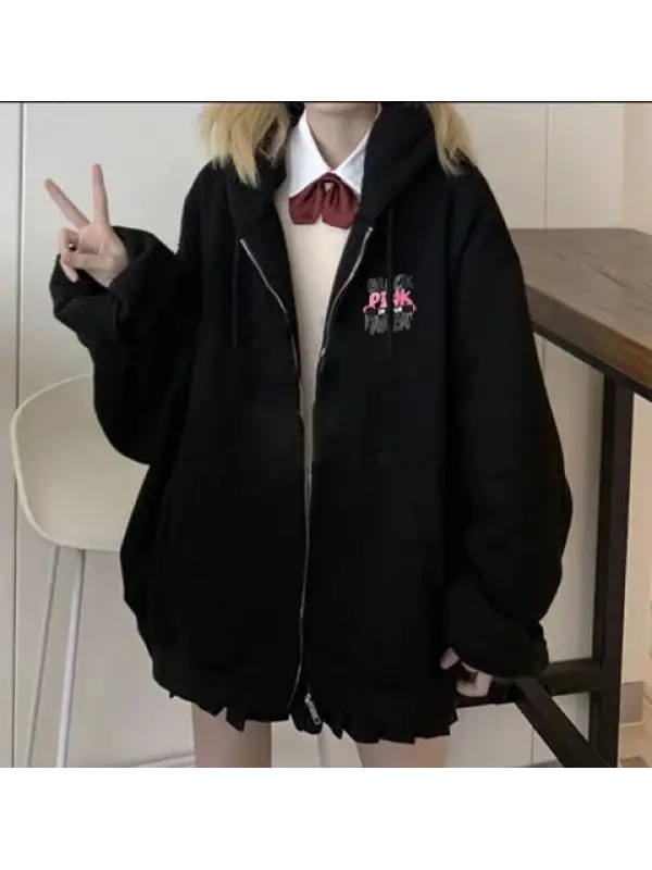 Black Pink Baskılı Oversize Fermuarlı Siyah Unisex Kapüşonlu Hırka