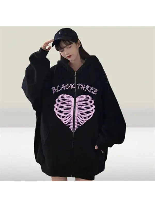 Black Three Cage Heart Baskılı Oversize Fermuarlı Siyah Unisex Kapüşonlu Hırka