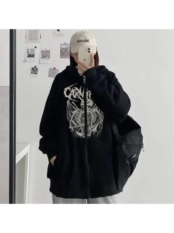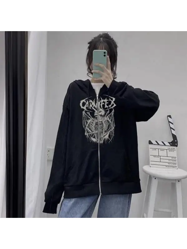 Carnifex Baskılı Oversize Fermuarlı Siyah Unisex Kapüşonlu Hırka