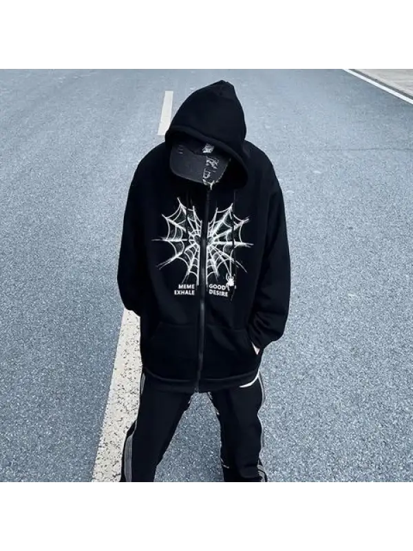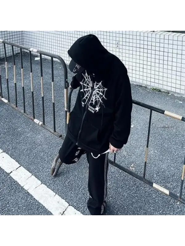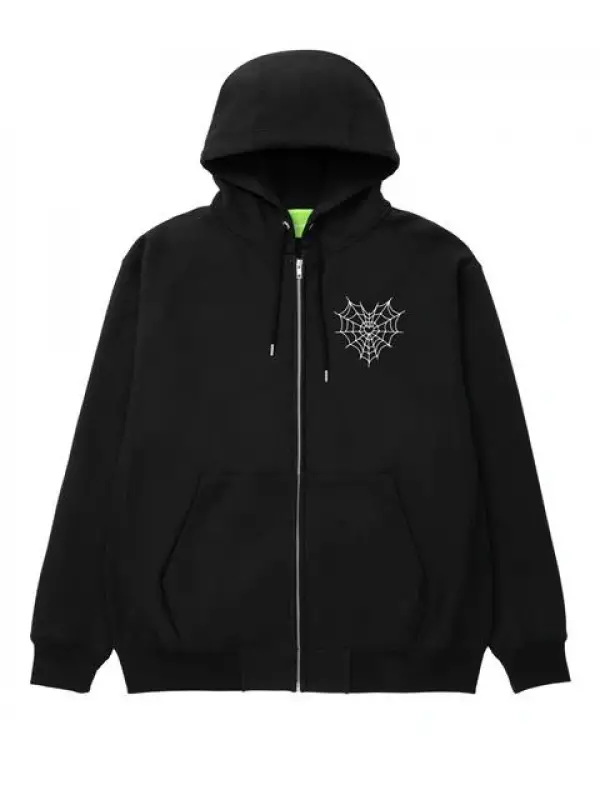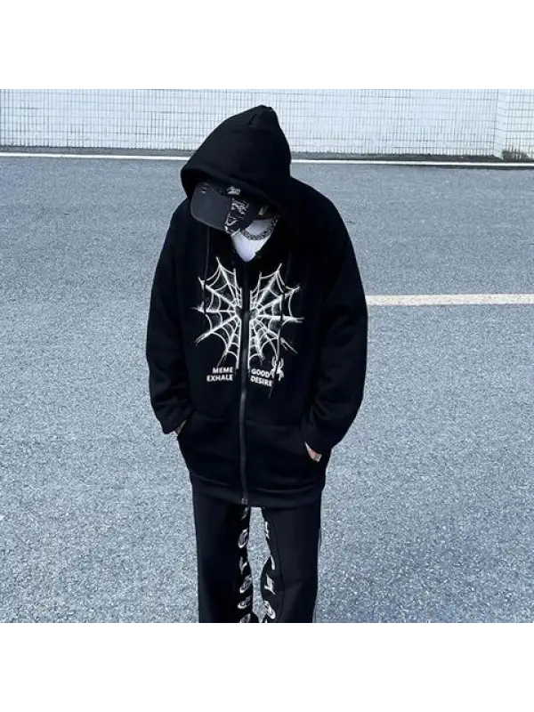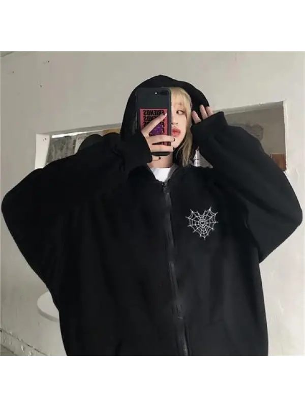 Heart Spider Web Baskılı Oversize Fermuarlı Siyah Unisex Kapüşonlu Hırka