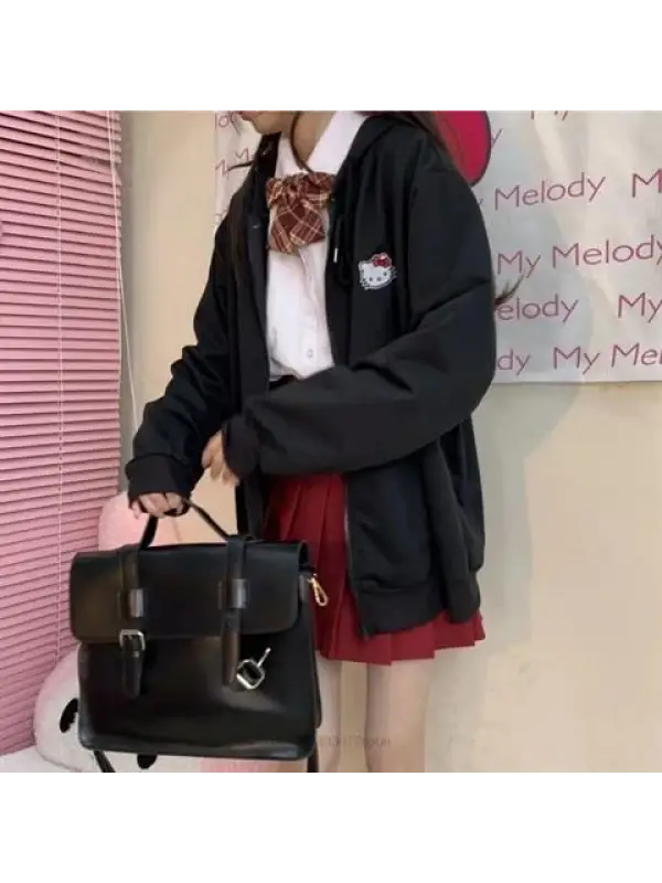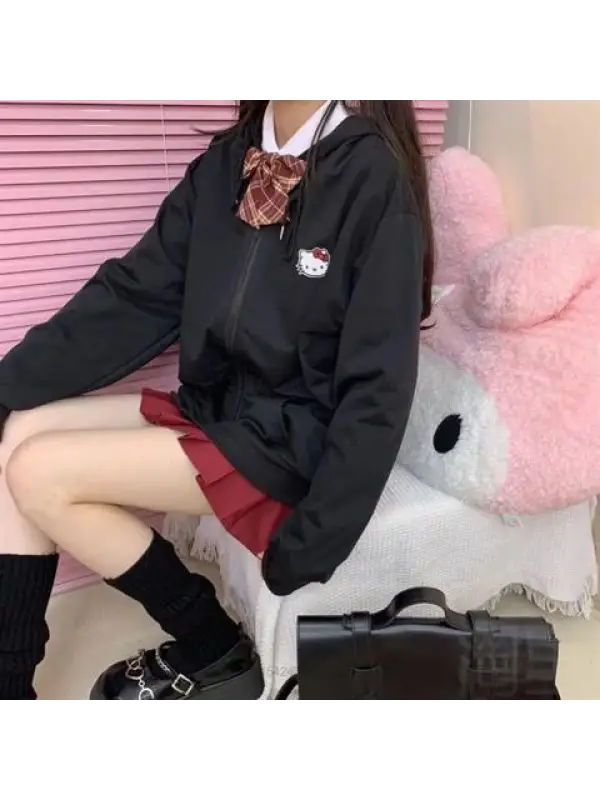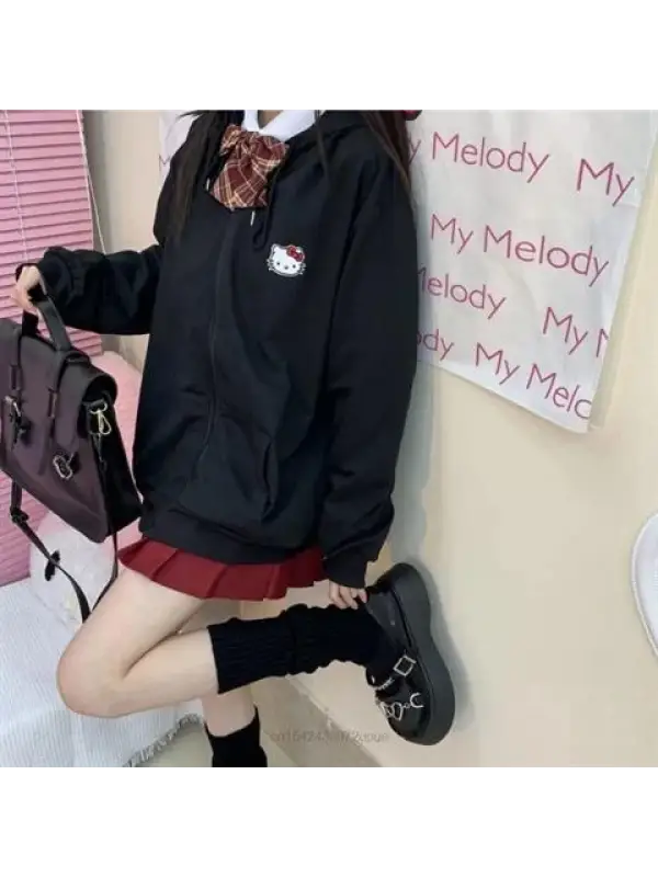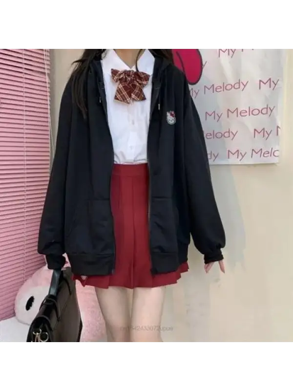 Hello Kitty Head Baskılı Oversize Fermuarlı Siyah Unisex Kapüşonlu Hırka