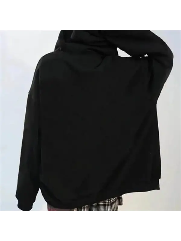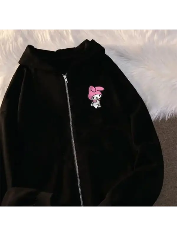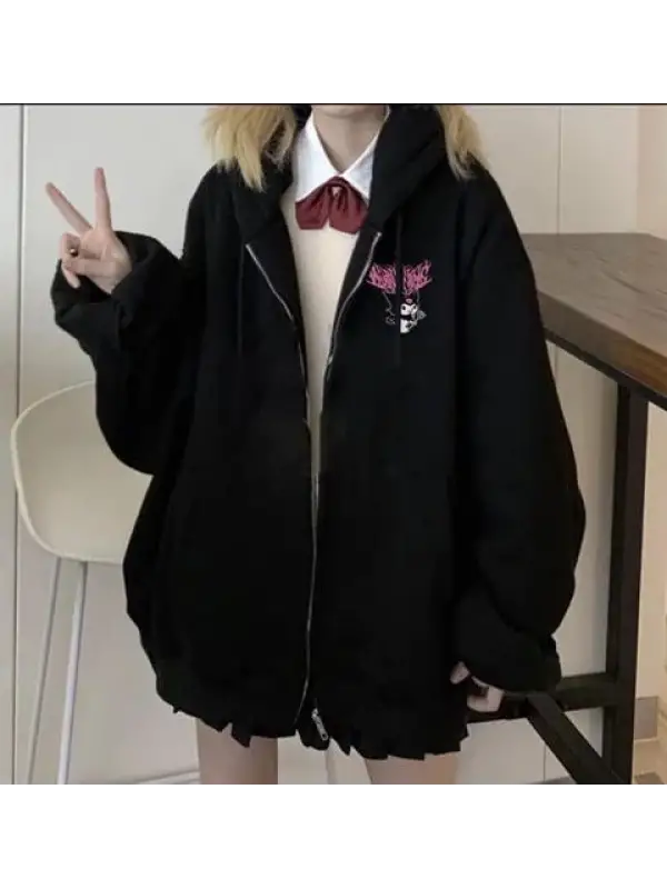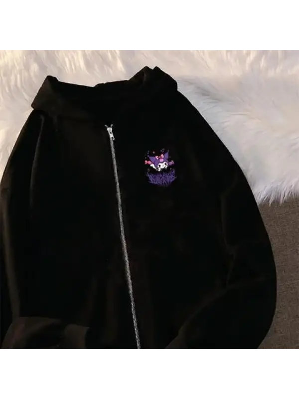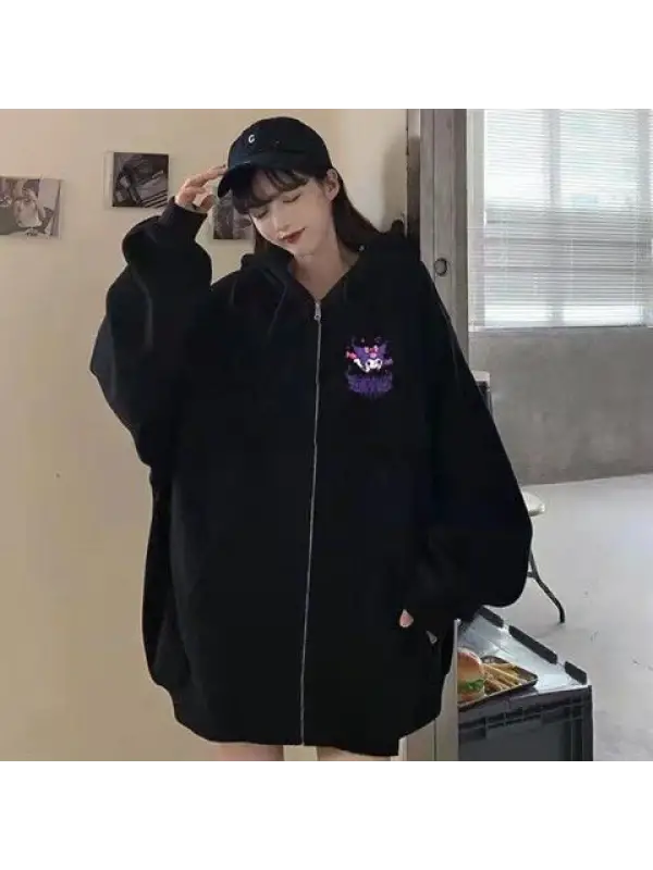 Kuromi Baskı Oversize Fermuarlı Siyah Unisex Kapüşonlu Hırka