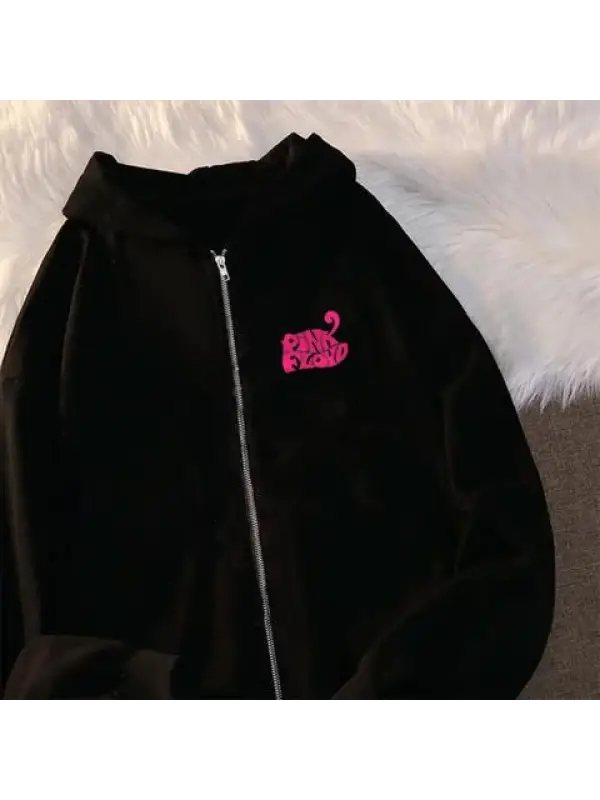 Pink Floyd Baskılı Oversize Fermuarlı Siyah Unisex Kapüşonlu Hırka