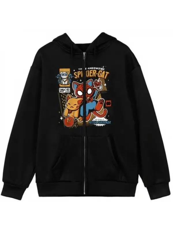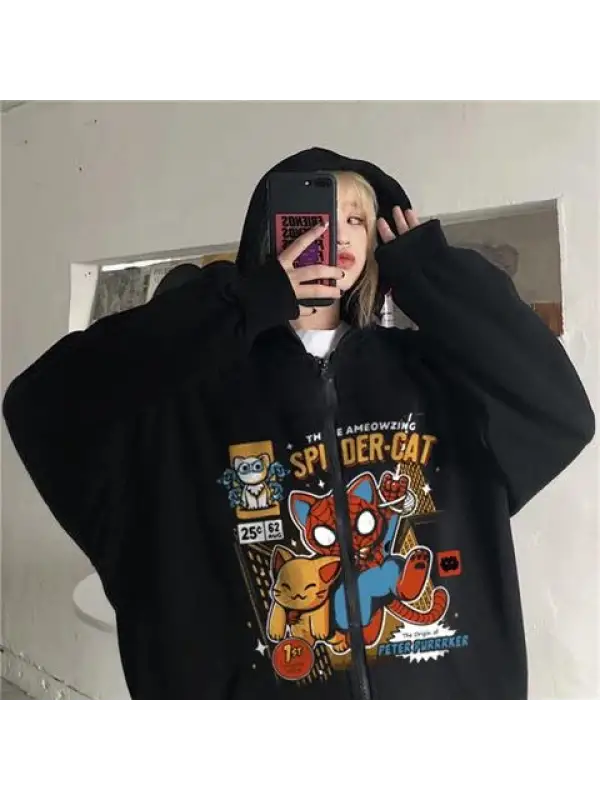 Spider-Cat Baskılı Oversize Fermuarlı Siyah Unisex Kapüşonlu Hırka
