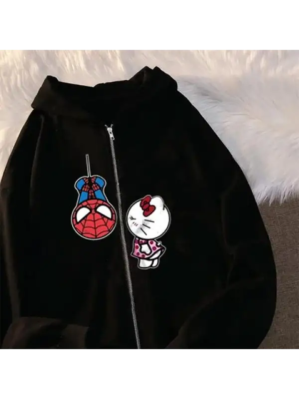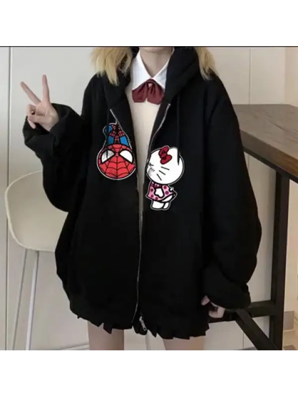 Spider-Man & Hello Kitty Baskılı Oversize Fermuarlı Siyah Unisex Kapüşonlu Hırka