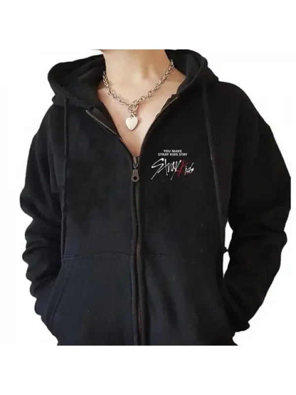 Stray Kids Baskılı Oversize Fermuarlı Siyah Unisex Kapüşonlu Hırka