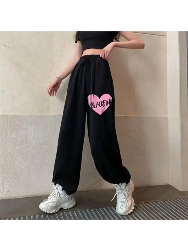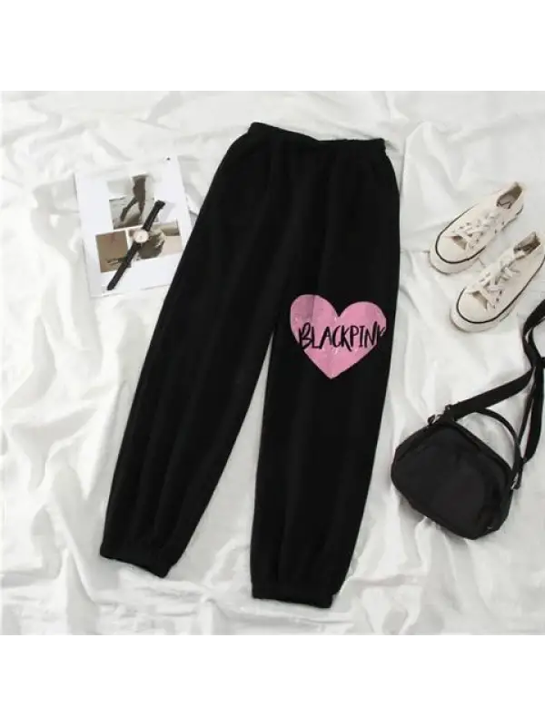 K-Pop Serisi Blackpink Heart Baskılı Oversize Unisex Siyah Eşofman Altı