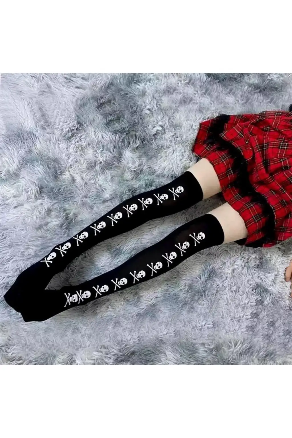 ESC BUTİK'in özel tasarımı olan Gothic Punk Harajuku Kuru Kafa Siyah Diz Üstü Çorap, tarzınızı tamamlayacak eşsiz bir parçadır.