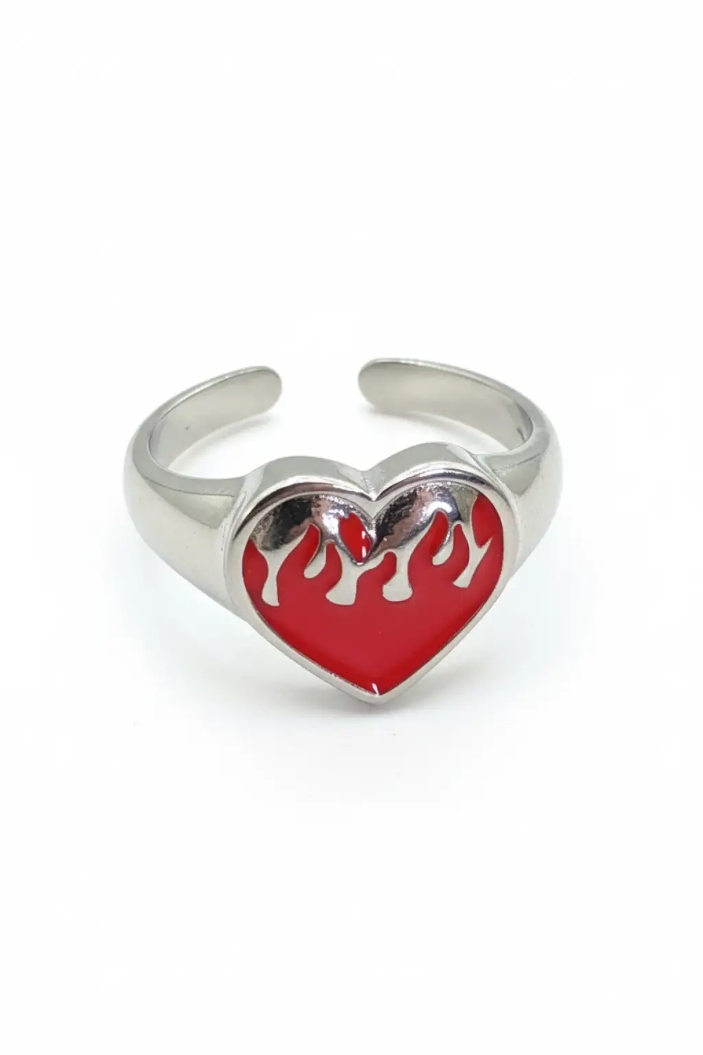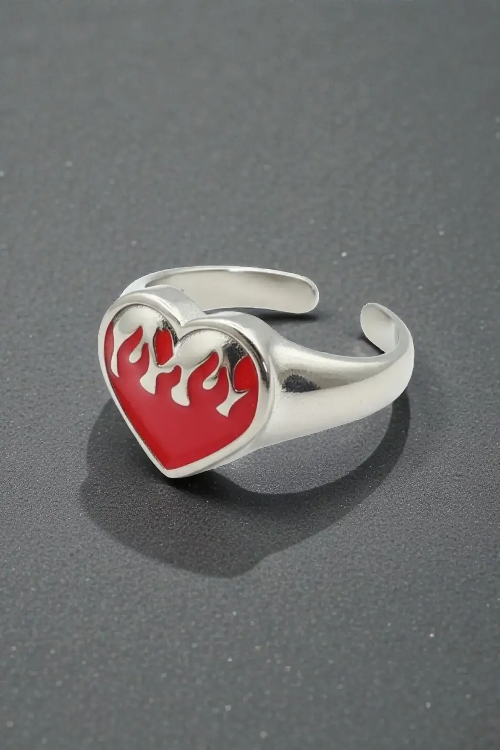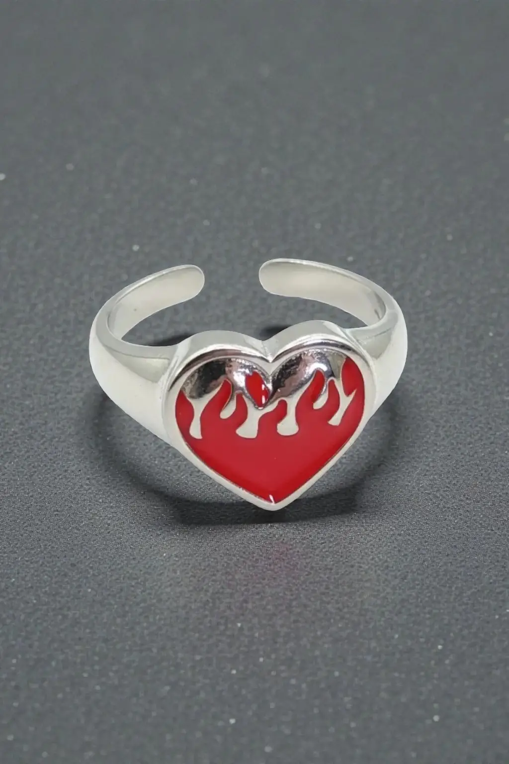 - Y2K tarzı alevli kırmızı kalp yüzük