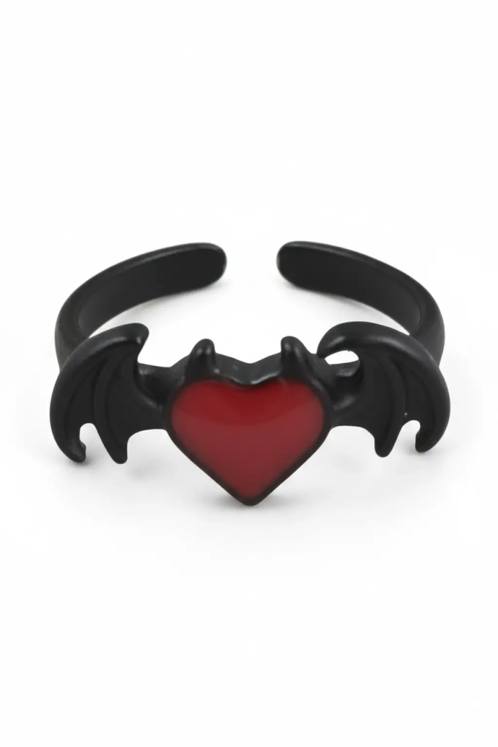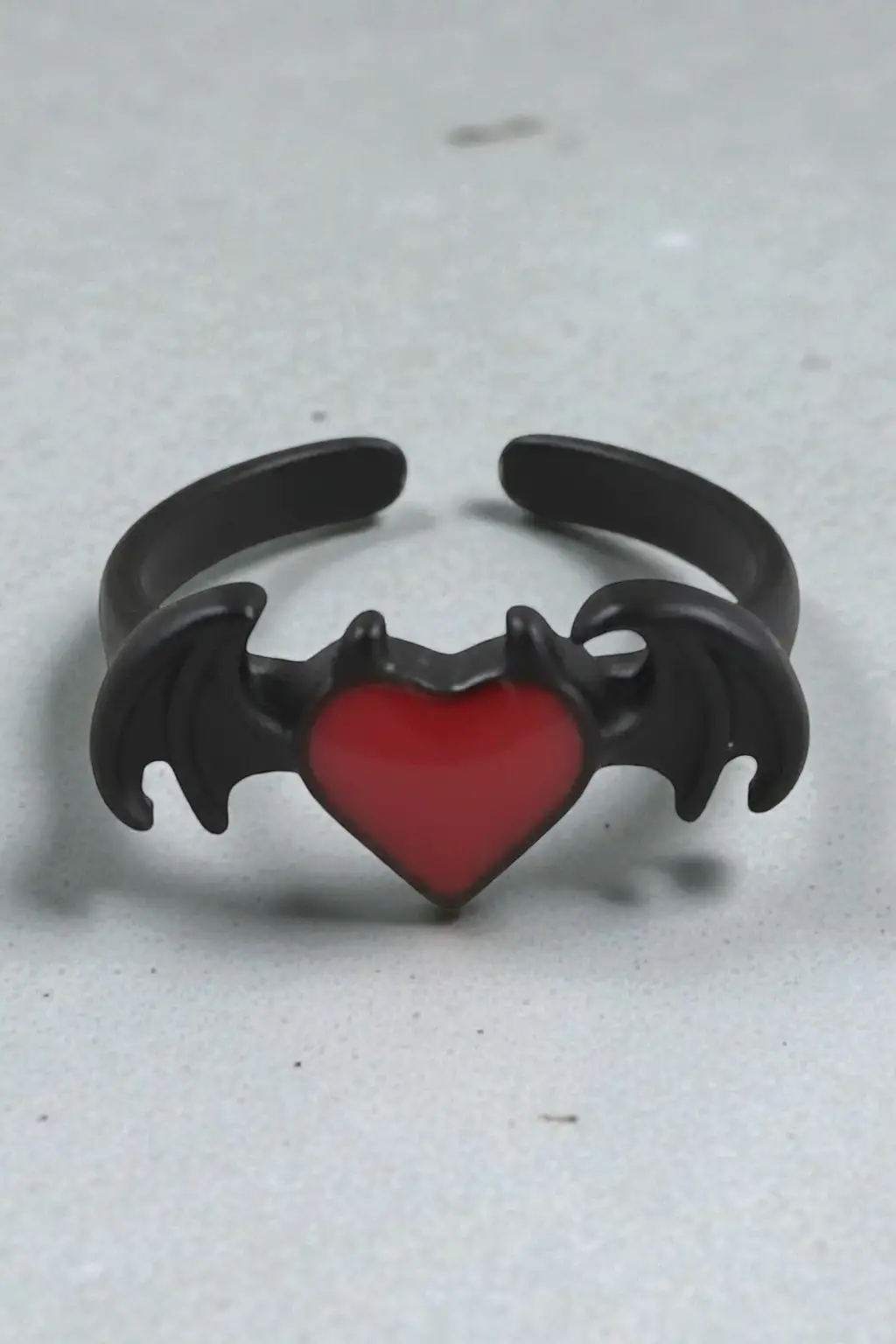 Bu eşsiz yarasa kanatlı kalp desenli kırmızı yüzük, Gothic punk tarzını yansıtan bir tarz arayanların favorisi olacak! Grunge ve Y2K sokak modasının gözdesi olan bu yüzük, tarzınıza kattığı farklılık ile göz kamaştıracak.