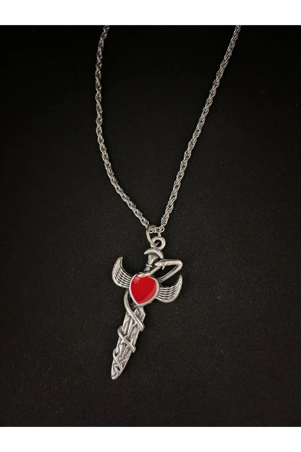 Gümüş Kaplama Paslanmaz Çelik Unisex Kırmızı Motifli Pentegram Aksesuar Zincirli Kolye, ESC BUTİK markasıyla göz alıcı bir tasarım sunuyor.