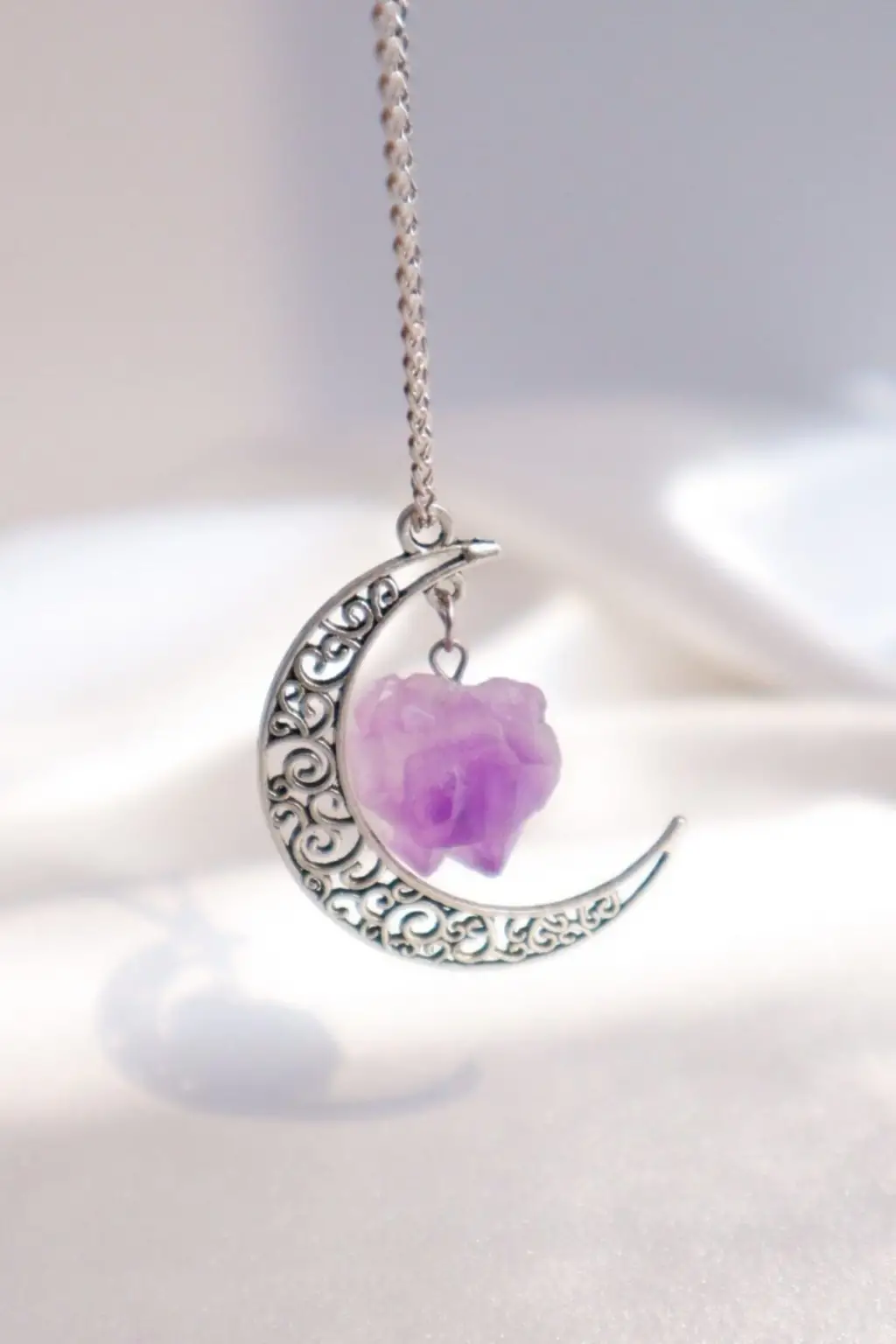 ESC BUTİK'in özel tasarımı olan İhtişamlı Doğal Taş Amestist'li Moon Hediyelik Kolye, her tarz kıyafetinize zarif bir dokunuş katacak.