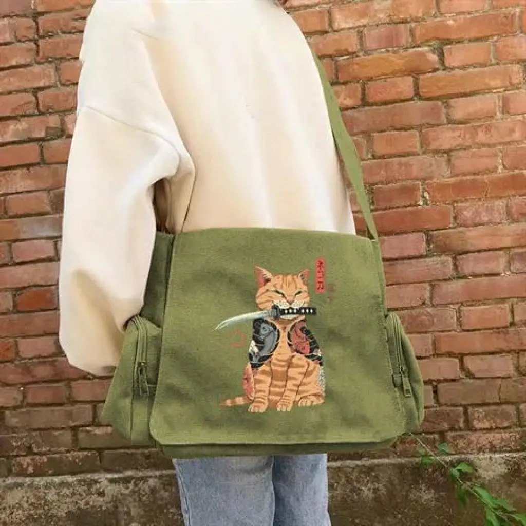 Killer Cat Baskılı Unisex Yeşil Postacı Çantası