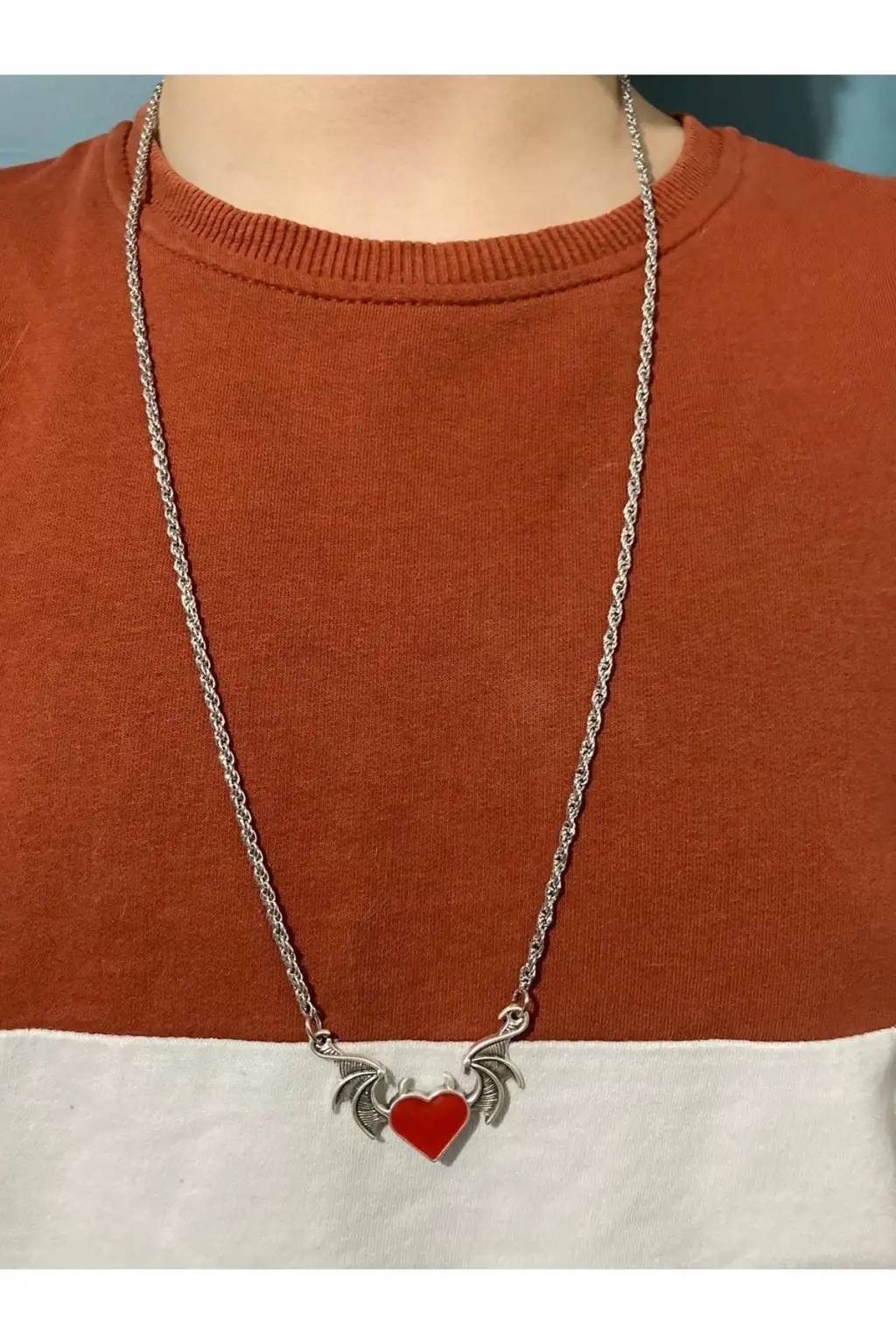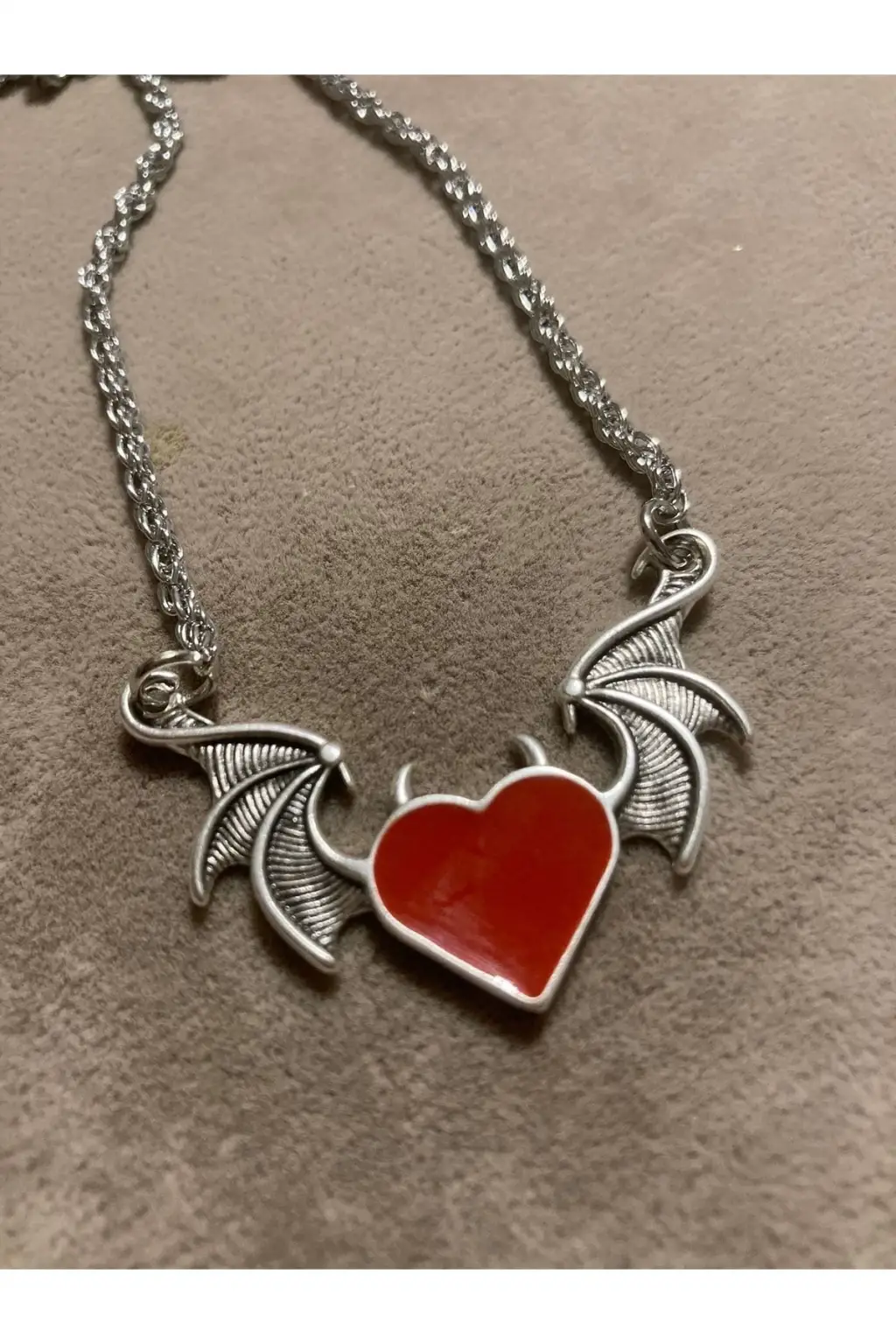 Kırmızı kalp detaylarıyla romantik bir hava katan bu kolye, yarasa kanatları ile de farklı bir stil yaratır.