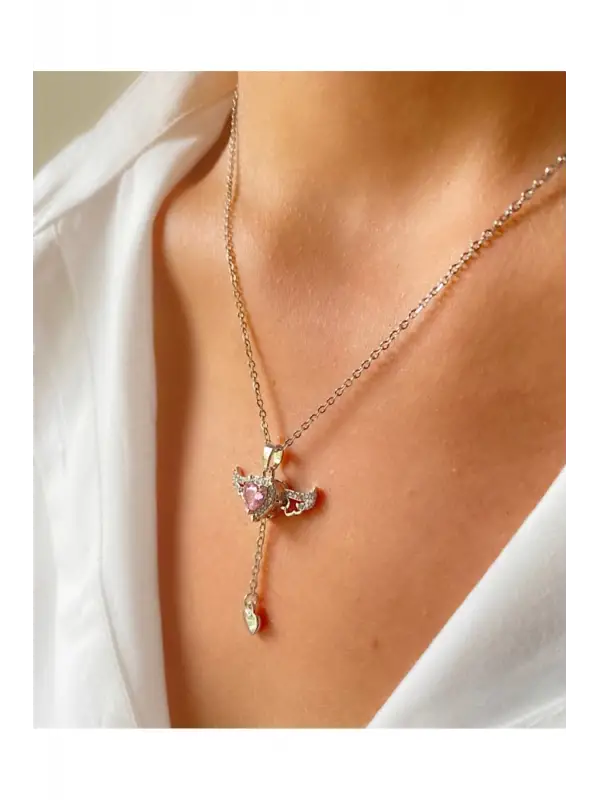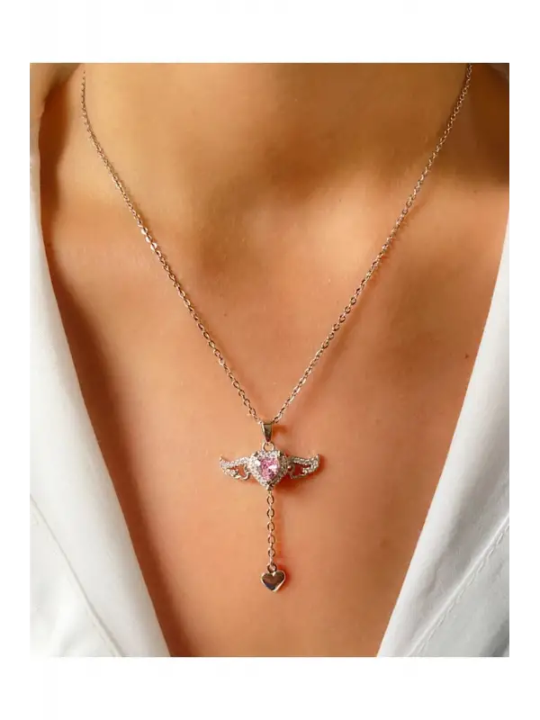 Pembe Zirkon Taşlı Melek Kanatlı Hareketli Paslanmaz Çelik Kolye