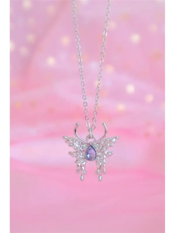 Gümüş Renk Zincirli Mor Taşlı Kelebek İthal Kolye