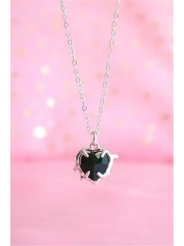 Gümüş Renk Zincirli Siyah Kalp Pençe İthal Kolye