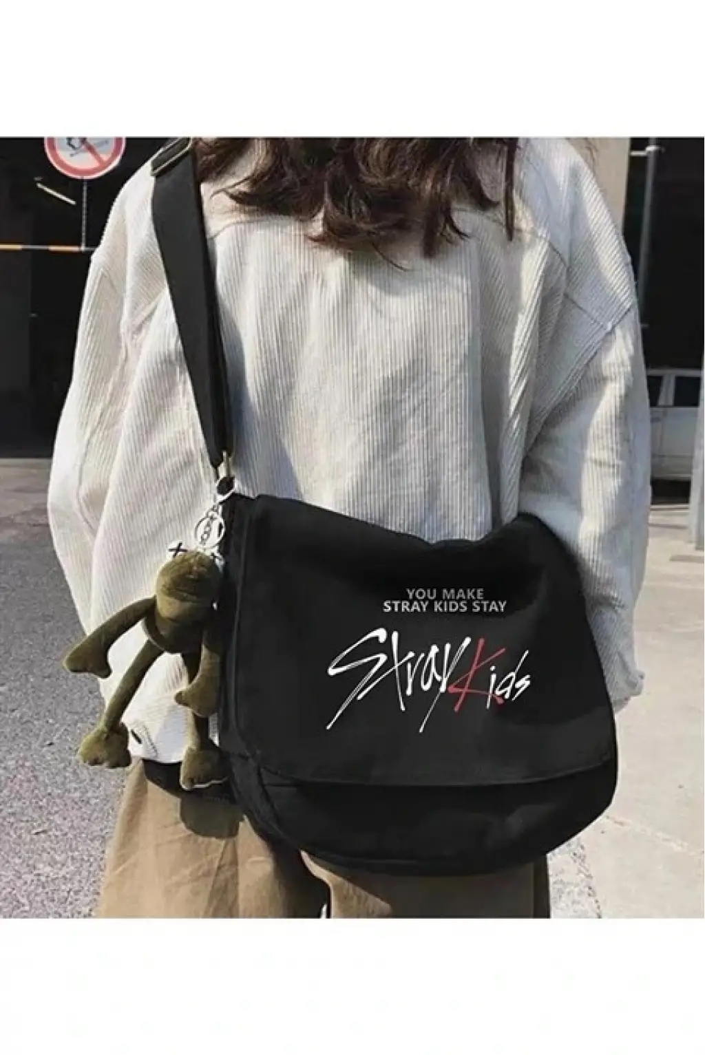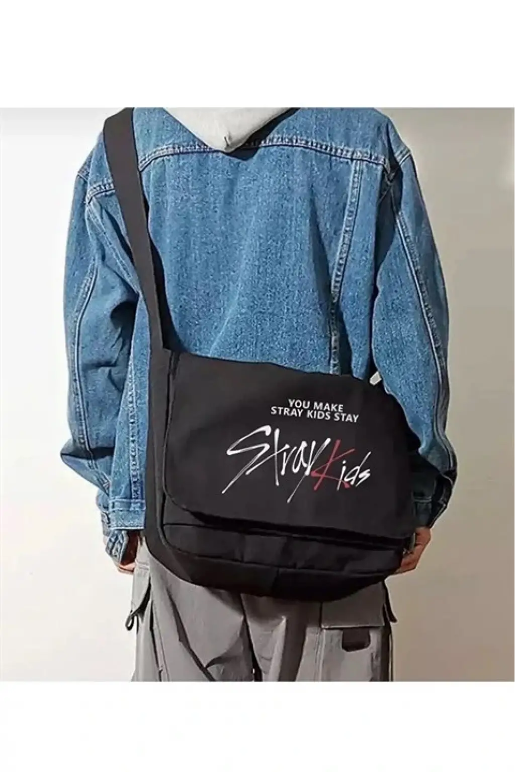 Touz Özel Koleksiyonu Postacı Çanta Serisi ; Kpop Serisi Stray Kids Baskılı Unisex Siyah Postacı Çantası