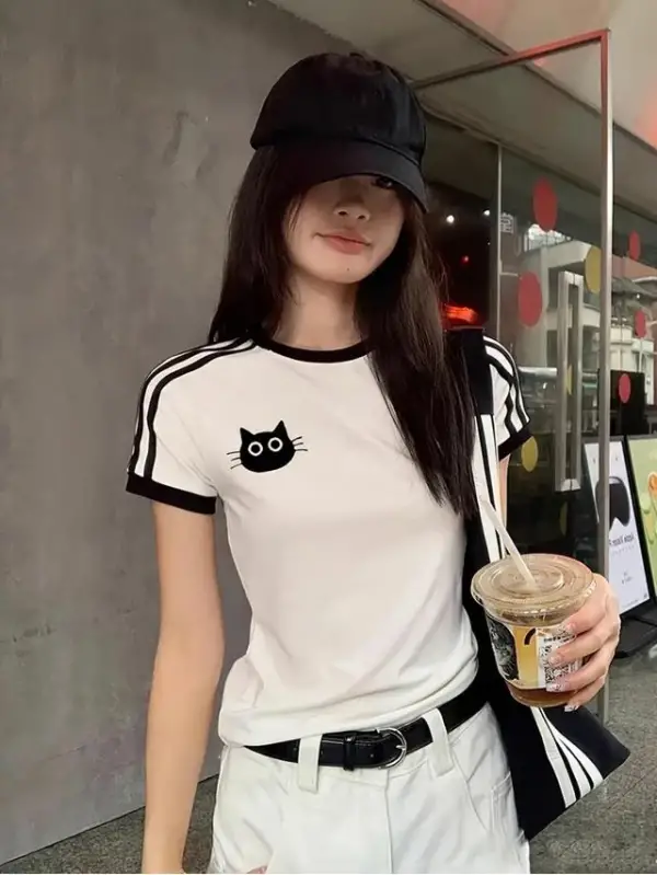 Toptan Cat Baskılı Şeritli Bluz Body Crop