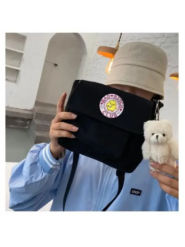Bad Bitch Club Baskılı Cep Detaylı Unisex Kanvas Siyah Omuz Çantası