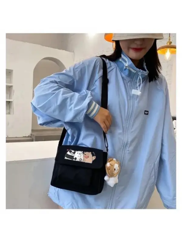 Buddy Bears Baskılı Cep Detaylı Unisex Kanvas Siyah Omuz Çantası