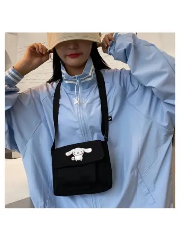 Cinnamoroll Baskılı Cep Detaylı Unisex Kanvas Siyah Omuz Çantası