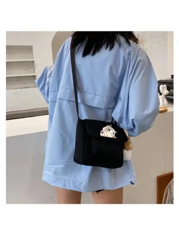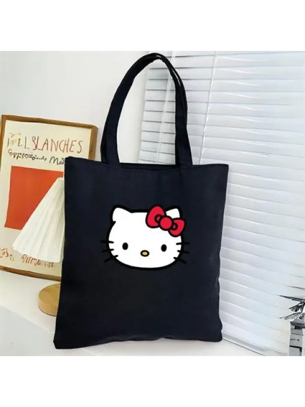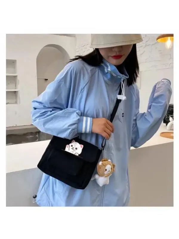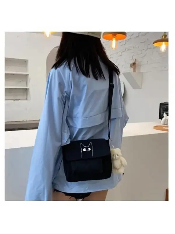 Sweet Cat Baskılı Cep Detaylı Unisex Kanvas Siyah Omuz Çantası